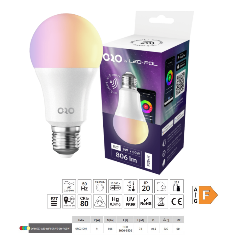 Lâmpada Smart LED WIFI - TUYA ORO E27 A60 9W RGB+TW (3000K-6500K)