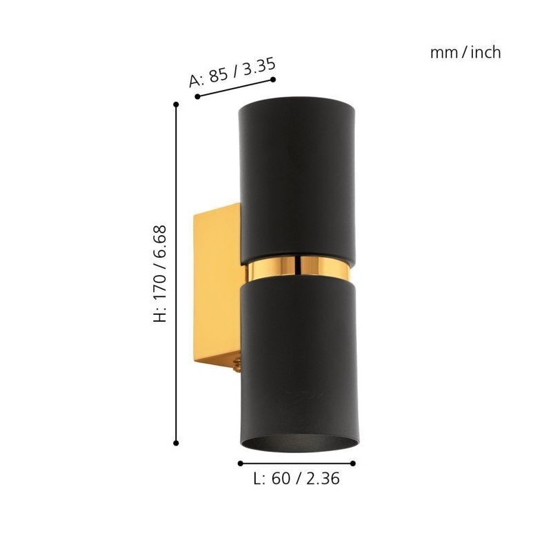 Aplique LED de Parede EGLO Passa Cilindro Aço Preto/Ouro 2x GU10 3W Luz Quente