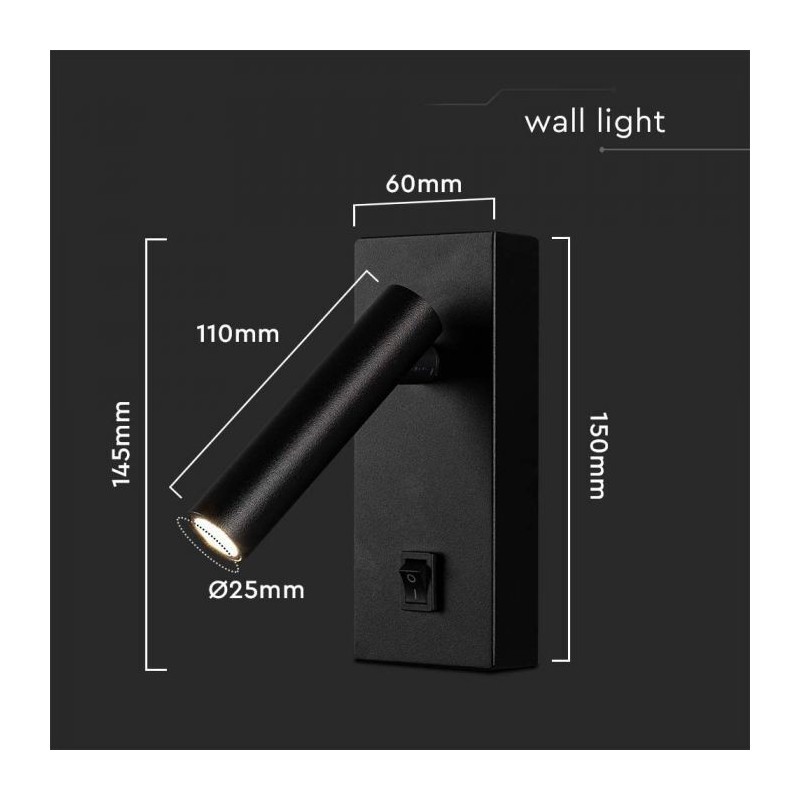 Aplique LED de Parede c/ Interruptor V-TAC 2W Preto Luz Quente (3000K)